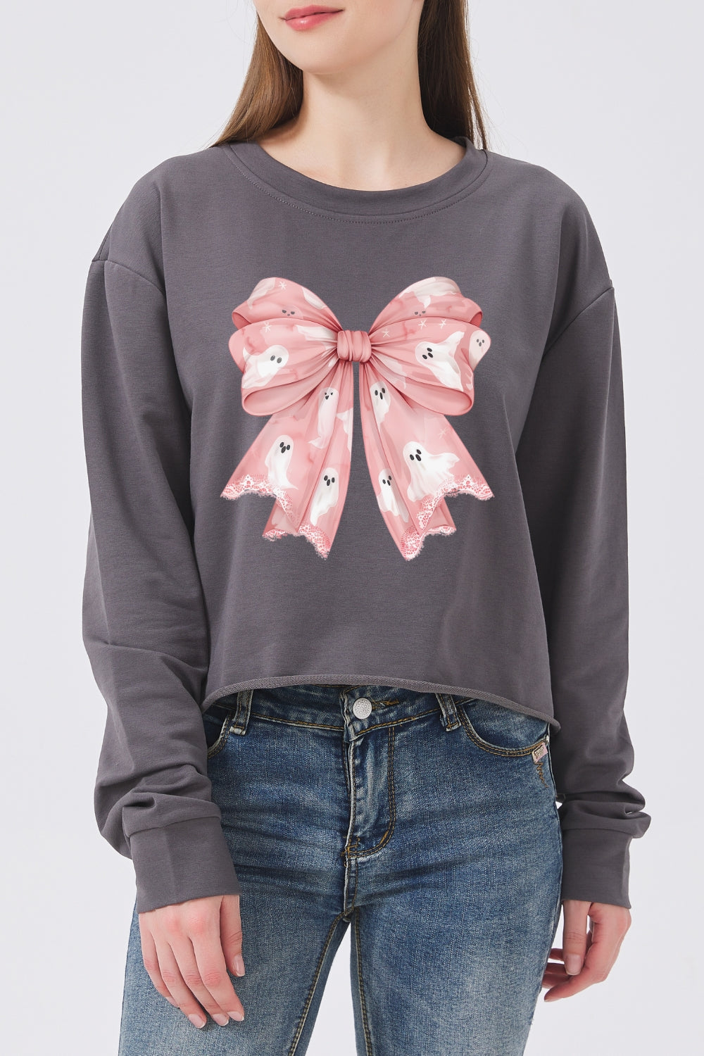 Pink Cute Ghost Bow Crop Sweatshirt For Women