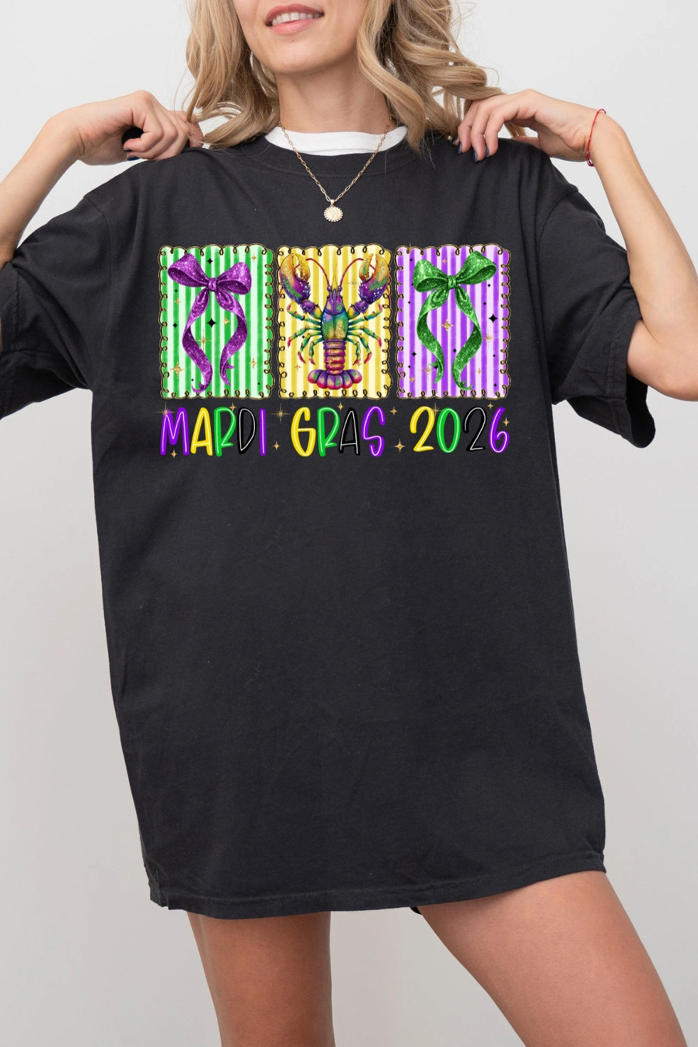 Mardi Gras 2026 Crawfish And Bow Tee For Women